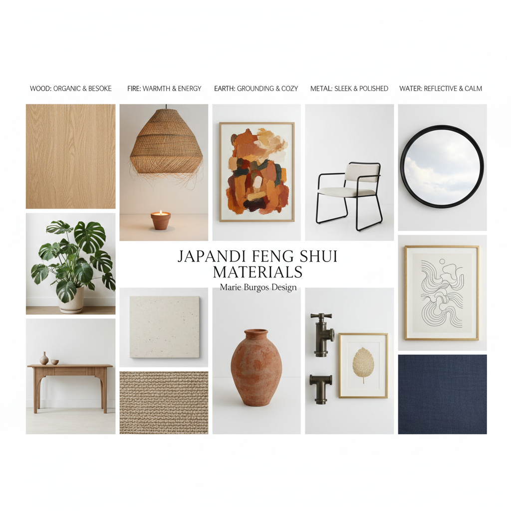 A comprehensive Japandi material board by Marie Burgos Design illustrating the five elements of Feng Shui: Wood (organic oak), Fire (straw lighting), Earth (terracotta and stone), Metal (sleek dark fixtures), and Water (serene navy textiles). This layered texture guide showcases how to balance natural materials for a harmonious modern home.